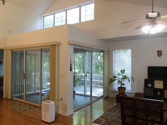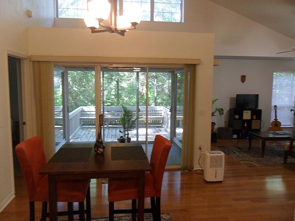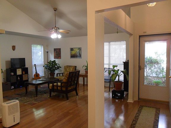 This is a charming two bedroom/two bathroom house located on a quiet cul-de-sac; it is only a two block stroll to the shops, restaurants, and farmers' market in quaint downtown Haile Village. The house has classic hardwood floors and a flowing, open interior design with cathedral ceilings in the living/dining area. There is a master bedroom with its own full bath and a walk-in closet. The second bedroom has a bathroom just out in the hallway. The kitchen has a breakfast nook that gets nice light in the morning, and the main dining area flows into the living room. The kitchen has a good amount of cabinet space and a big pantry. The garage has a brand new automatic door and plenty of space for storage. There is also a fully enclosed porch area (so no mosquitoes) and a back deck surrounded by trees and other flora. This location has peace and privacy, but it is also so close to the amenities and social vibe of downtown Haile Village. It is available on July 1st. Owner pays trash.