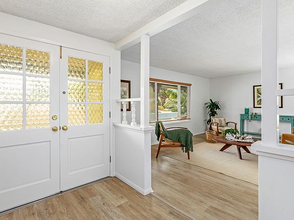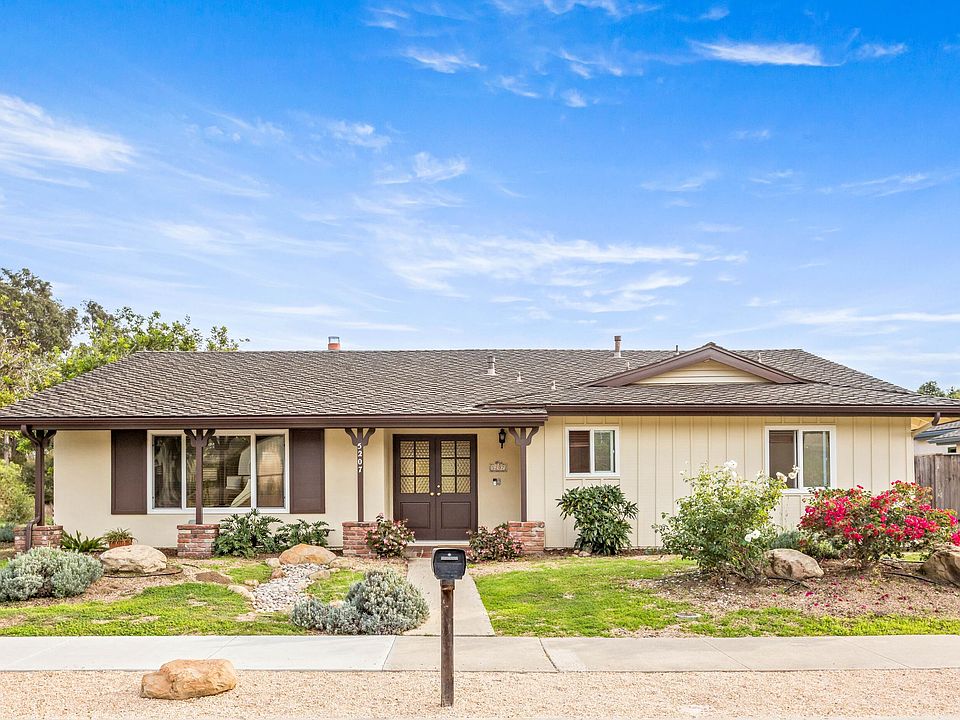 Situated on a spacious corner lot, this inviting three bedroom, two bath home is move-in ready! The property has undergone several enhancements over the years, including a remodeled kitchen featuring custom cabinetry, quartz counters, and stainless steel appliances. The hall bath has also been updated with a new tiled shower and vanity. Luxury vinyl plank flooring has been installed in most of the home, complemented by dual-pane windows. The well-designed floor plan includes a dining area next to the kitchen and family room with a classic brick fireplace. Natural light and mountain views accentuate the living room. The family room has access to the backyard, featuring a large paver patio perfect for entertaining, and several fruit trees. Additionally, there is a detached two-car garage with connecting breezeway, and both the interior and exterior have fresh new paint. Calle Barquero open space is across the street and just a few minutes to Calle Real and Fairview Centers, UCSB and Goleta Beach.