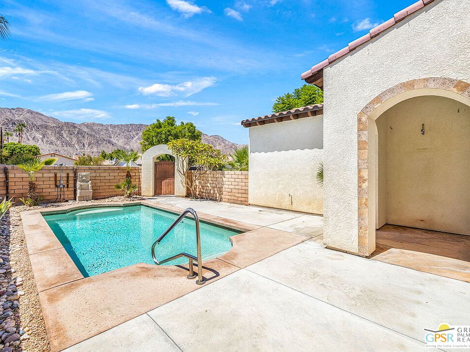 WOW FACTOR abounds with big mountain views and a sparkling pool that take center stage at this walled and private home in La Quinta Cove. French doors create fabulous indoor-outdoor flow, while wood flooring runs underfoot and bedrooms are thoughtfully separated for privacy. The open-concept floor plan features a kitchen with center island and breakfast bar, stylish cabinetry, quartz counters, and a built-in desk. The great room opens to a private courtyard with pool and dramatic western mountain views, while additional patios, including a covered outdoor living space at the rear of the home, frame the main living area. The primary ensuite offers a walk-in closet, direct patio access, dual vanities, and a separate tub and shower set in tile. The second bedroom includes a walk-in closet, and the third bedroom, set behind double doors, doubles as an ideal office. Newly installed carpeting adds comfort in the bedrooms, and the interior has been freshly painted throughout. Window treatments include classic shutters, and the home also offers a drywalled and insulated garage, tankless water heater, and desert-friendly landscaping. Just minutes from Old Town La Quinta, this home comes with no HOA fees on land you own. Be sure to take the Matterport virtual tour for a full sense of the flow.