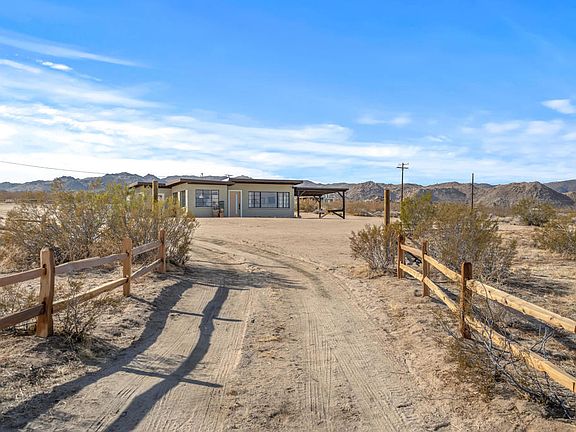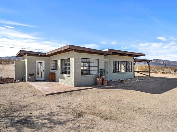 This stunning mid-century home, situated on a breathtaking 5-acre property, offering a perfect blend of modern comfort and timeless desert charm. Designed with clean lines, large windows, and open-concept layout, that seamlessly integrates indoor and outdoor living. Expansive casement windows frame sweeping views of the rugged Mojave landscape, from rolling desert hills to distant mountains painted in golden hues at sunset. The interior features a minimalist ranch aesthetic that enhances the home's architectural elegance. A spacious living area opens to a chef's kitchen, complete with sleek cabinetry, stainless steel appliances, kitchen dining area and bar top. The bedroom is serene, with casement windows that let in soft natural light and offer uninterrupted views of the vast desert sky. Outside, a sprawling shaded lounge area creates an ideal space for stargazing or soaking in the peaceful solitude of the high desert. This mid-century gem captures the magic of desert living-where design meets the untamed beauty of the California wilderness. Home has been verified by SB County as a STR property if you decide to apply for permit. Expand another 5 acres to the adjacent parcel currently for sale.