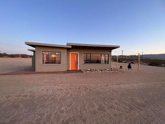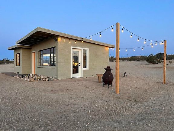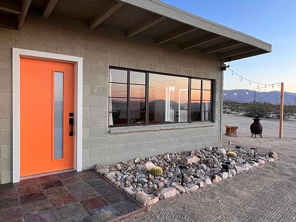 5 Acre Horntoad Ranch... Mid Century 1955 Block Home featuring a Butterfly Design on 5 expansive acres of beautiful Mojave Desert land. Just 9 minutes from Giant Rock Meeting Room and close to other popular locations such as Pioneertown and Joshua Tree. The King of the Hammers annual Off-Road Event is just across the Hwy. Loaded with casement windows, three glass doors and unbelievable views all around. Beautifully redone home with an open spacious feel. 60'' electric fireplace with heat with accompanied by a custom tile hearth and wood mantle. Breakfast bar and incredible dining space with more windows plus the all new kitchen, bathroom and indoor laundry room with a side door for easy entry with groceries. One cozy bedroom with direct bathroom access. This home is gorgeous and ready for your enjoyment! The original outhouse has been converted to a very cool trash can and tool shed. Brand new 2500 gallon water tank and pump system. RV parking with hook ups. Long winding driveway from the front on Ocotillo or side access from Horntoad. Per San Bernardino County... to qualify for an STR Permit, a well would be required. Only 55 minutes to Downtown Palm Springs.