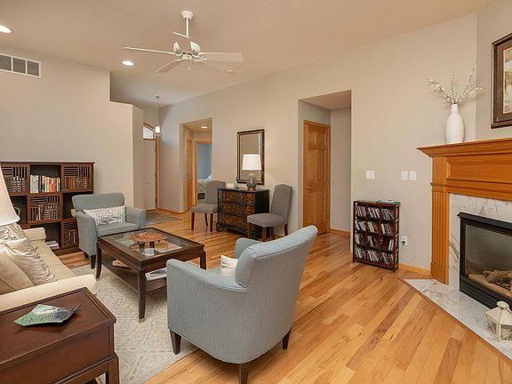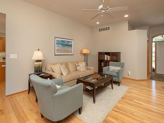 Immediately upon entering your first thoughts will be “beautiful, meticulously cared for and no steps anywhere!” You will just love the maple wood flooring throughout most of the main floor and the towering living room ceiling creates a setting of spaciousness. This 2-bedroom, 2-bathroom home is absolutely move-in ready and one that you will want to invite friends and family to be part of. The expansive living room is equipped with an attractive and cozy gas fireplace. As you enter the 4-seaon sunroom, you will be delighted with the transom window and French doors; this is the room of peaceful relaxation. You’ll almost feel part of the wooded outdoors where you can enjoy nature in your backyard. The dining area also has a wonderful view of the patio and backyard. It is open to the kitchen equipped with stainless steel appliances and beautiful quartz countertops with an undermount sink. Additionally, there is an eat-in snack bar, pantry with pullout drawers, and of course the continuation of the exquisite maple wood flooring. The primary bedroom is generous in size and has a spacious walk-in closet and convenient ¾ bathroom. The 2nd bedroom is great for guests or can be used as an office or craft room and is adjacent to the full bathroom. The main floor laundry (washer/dryer stay) adds to the efficiency of this townhome. Other amenities that put this home over the top are paneled doors, beautiful blinds throughout, updated light fixates, steel siding, storage galore off of the living room and above the garage. Updates include new AC in 2024, and a new water heater and softener in 2023. With the high-pitched roof lines and arched entry way, the curb appeal is strong and draws you in. Up to 2 pets are welcome if they are under 20 lbs. each. No rentals allowed. This home is located on a quiet cul-de-sac near shopping, restaurants, the Douglas trail for bicycling and walking, a park and easy access to Hwy 52.