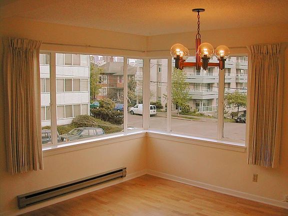 Views with new appliances, brand new deep kitchen cabinets, closet space, big walk through kitchen separate from the dining area, panoramic windows providing lots of natural lighting and a grassy courtyard to enjoy during the Seattle summer months!
