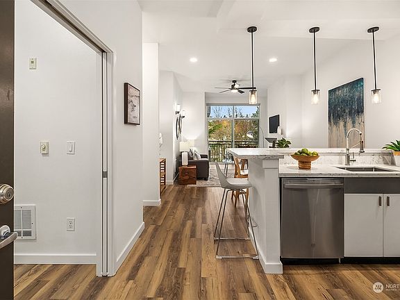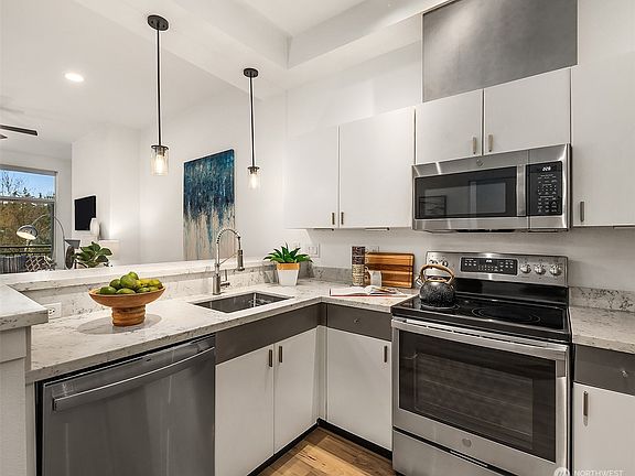 Convenience & style awaits in this recently refreshed condo within the community of SOHO near DT Kirkland. Open floor plan with soaring ceilings & large windows allowing tons of natural light to flood in. Gleaming quartz counters, LVP flooring, updated trim, lighting, appliances & brand-new paint throughout. Spacious primary featuring a walk-in closet with custom built-ins & an awesome flex-space for an office or 2nd bedroom. Dine al fresco or sip morning coffee on the private Juliet balcony off the cozy living room. Secure parking garage & entry. Pet friendly, no rental cap and short term rentals are allowed! Ideal location - Short walk to all DT Kirkland has to offer. Restaurants, Kirkland Urban, beaches, parks/trails! Easy access to 405