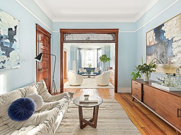 The sprawling garden level features a ballroom-sized open living and dining area, highlighted by bay windows, intricate moldings, and pristine parquet floors.