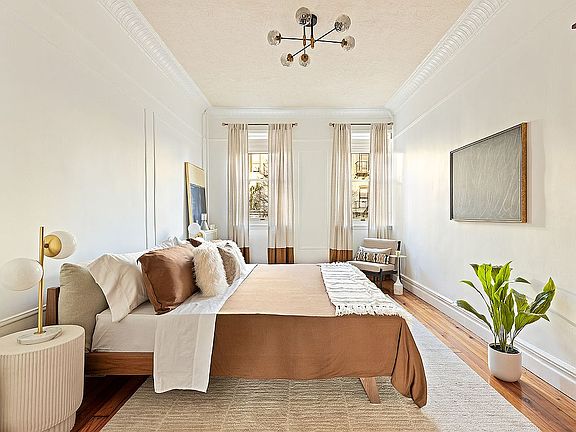 The sun-filled parlor level showcases two spacious bedrooms, high ceilings, and beautifully preserved pine wood flooring.