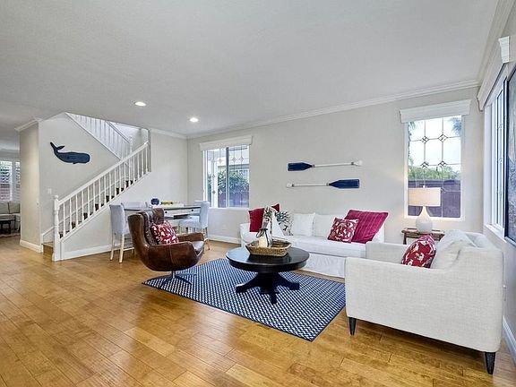 Welcome to beautiful San Pacifico, a gated community with a two minute walk to South Ponto beach! Live the dream in this coastal gem, west of the 5 freeway, inside this completely upgraded retreat. The exterior has just been painted and showcases excellent curb appeal. Once inside you'll love the warmth from the natural light and array of windows. The color palette is neutral and inviting, and there are beautiful hardwood floors throughout the entire property. The formal living room is perfect to lounge and relax, or have a game night. The family room opens to the kitchen which is perfect for entertaining. There is a kitchen island and plenty of counter space, shaker white cabinets, stainless steel appliances, crown moulding, and a custom shiplap wall. The family room leads you to the backyard which is the perfect setting to host gatherings and enjoy the year round coastal weather. There is a covered patio, perfect to BBQ, relax and make memories. There is artificial turf and the fence has been recently painted which leaves very minimal maintenance. This is one of the larger lots in the community with plenty of space to enjoy the outdoor lifestyle Carlsbad offers. There are three guest rooms upstairs, two with their own walk-in closets. The guest bathroom includes a double vanity, and separate tub and shower combo. A full laundry room with sink and storage is located upstairs. The primary suite includes crown moulding, beadboard, and a light and bright space. The primary en-suite bathroom includes a double vanity, separate tub and shower and large walk-in closet. The house is gorgeous with no detail spared. The gated San Pacifico community is equally impressive with a sparkling community pool, spa, tennis/pickleball courts and basketball court. Located in top rated Carlsbad school district. Walk to beach, shopping, dining and easy freeway access. Between the home and location, it doesn't get any better than this!