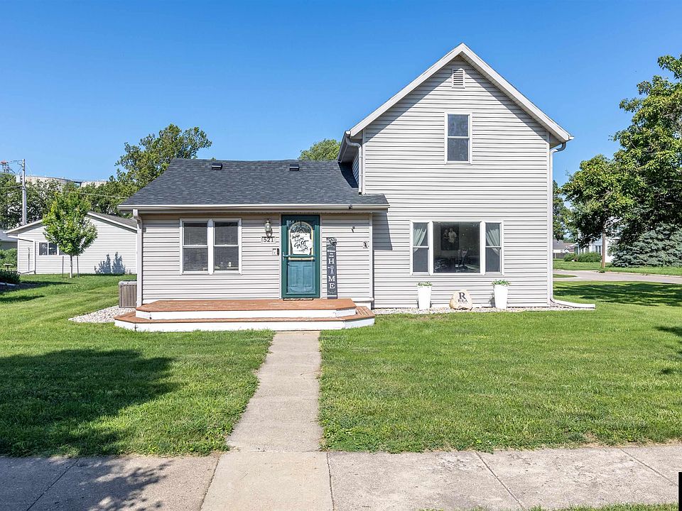 Come home to 521 Beall Street in Sloan, IA on an oversized corner lot. Let's walk inside the front door to your front room that is currently being used as office space. Just off the front room is your dining room, oversized with lots of space to entertain. On the main level you have wood flooring throughout the rooms & tile in the kitchen & laundry space. Your living room is open concept to the dining space & has an electric fireplace. You have 2 main floor bathrooms. One off the master bedroom & one just off the dining room space. The kitchen has so much cabinet space with lots of counter space for entertaining too! Great drop all space inside the back door also that is off the kitchen! Laundry on the MAIN is a huge bonus! Upstairs you will find 2 bedrooms & a closet storage space. Head outside to your 2-car detached garage with great storage, oversized driveway, and a cute shed for lawn/gardening space. The current owners have added a nice patio space just off the garage space. Updates since owning have been new flooring in the master bedroom, paint throughout, & a new roof in 2024. Make sure to come check out this move in ready home.