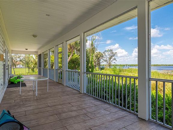 RIVERFRONT LIVING ON 1.27 ACRES IN PEACE RIVER CLUB W/NEW METAL ROOF, PRIVATE DOCK & ELEVATED VIEWS OVERLOOKING JIM LONG LAKE - Situated within the gated, waterfront community of Peace River Club, this custom-built, two-story home offers over an acre of riverfront serenity, 167 ft of shoreline, a private dock with 10,000 lb lift, and panoramic views of Jim Long Lake. Enjoy the timeless charm of a wraparound covered porch paired with a spacious, open interior layout designed for comfortable everyday living and effortless entertaining. A NEW METAL ROOF (2021) and automatic hurricane shutters on several second-story openings provide peace of mind while maintaining a classic Florida style. Inside, the great room impresses with volume ceilings and oversized windows that fill the space with natural light. Just off the entry, a media room or home office offers a quiet space to work or unwind. The kitchen blends seamlessly into the main living area and features granite counters, stainless steel appliances, a center island with cooktop, solid wood cabinetry, a wraparound breakfast bar, and a corner pantry. Adjacent to the kitchen, the dining area enjoys backyard and water views, creating a comfortable space for family meals or entertaining friends. Two guest bedrooms—each generously sized—share a Jack & Jill bath and are tucked just off the great room for privacy. A convenient half bath with porch access and a spacious laundry room with utility sink, storage cabinetry, and garage access complete the first floor. The two-car garage has been partially converted to a large L-shaped game room/flex space with room remaining for a golf cart, lawn equipment, fishing gear, or kayaks. Upstairs, the private owner’s suite features dual walk-in closets, a spa-inspired bath with dual vanities and a large walk-in shower, and a screened balcony with beautiful tongue-and-groove wood ceiling—perfect for taking in the peaceful water view. An additional upstairs guest room with a private front-facing balcony completes the second floor. Throughout the home, thoughtful features include crown molding, plantation shutters, central vacuum, and abundant storage including closets under the stairs. Recent updates include new LVT flooring throughout the first level and primary suite, new carpet on the stairs and upper guest room, new impact-resistant patio doors (front and back), and a new HE washer/dryer (2023). The dock walkway and railings were partially replaced (2022–2023), and the home is equipped with a 3-zone A/C system (units from 2015–2023). Outside, mature native landscaping, crushed shell walkways, and a tree-lined backyard lead you to the extended dock with water and electric at the 10,000 lb boat lift and a dedicated fishing pier. Bench seating invites you to relax and enjoy the sweeping western water view—ideal for watching the sunset with a drink in hand. Peace River Club is a gated, waterfront enclave of custom homes with estate-sized lots and a tranquil, natural setting. Located just minutes from downtown Punta Gorda, I-75, and area marinas, this community offers the perfect blend of privacy and convenience. Make an appointment today and start living your Florida dream on the river.