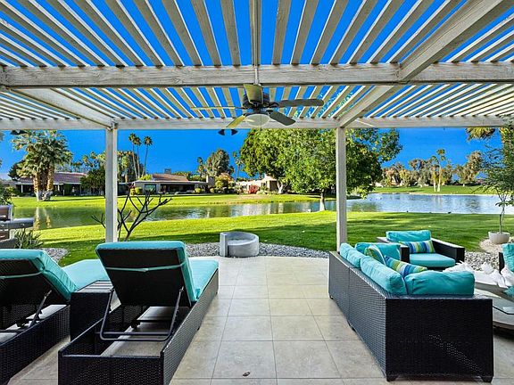 Stunning Lakefront Location with Mountain and Fairway Views of the Famed Tournament Course. Highly upgraded, Stylish Renovation with a Contemporary Ambiance. Enter the property through a gated courtyard with custom landscaping, tiled patio and covered outdoor living area. An entry hall leads to a dramatic light and bright Great Room with fireplace and wood beamed ceilings, custom built-ins and sliders to a large lakefront terrace. Great Room is Open to the Social Kitchen with slab granite countertops, Custom Bamboo like Cabinets with silver trim and interior Metal Drawers, updated Stainless Appliances with a glass and stainless steel counter seating opening to the Dining area with great views of the lake and mountains. Primary Suite with large bedroom featuring views and updated spa bathroom with stylish double vanity Copper Sinks , large shower and tub. Two guest suites each with its own updated bath provide room for family and friends or an office or gym. Covered Outdoor Living and Dining tub with spectacular lakefront mountain and golf views for great indoor/outdoor living. Come home to your lakeside desert retreat!