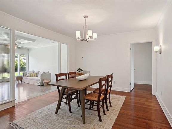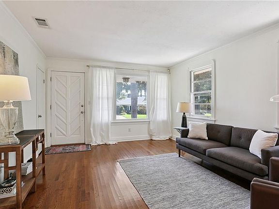Enjoy the serene lifestyle of oak tree lined West Lakeshore in this raised brick home conveniently located just 2 blocks from Harlequin Park, less than a mile from the lakefront, and walking distance to a grocery, bakery, gym, pharmacy, restaurants, daycare, and much more! Fantastic 3B/2.5B floorplan with living, dining, den, and large eat-in kitchen. Bedrooms feel very private from the living areas with a hallway that can be closed off. Spacious primary suite features a fabulous mid mod bathroom. Enjoy hardwood floors plus original terrazzo in the kitchen and den. Beautiful original moldings throughout. Backyard has plenty of room for a pool! New Roof 2022. Neighborhood security patrol through the LakeShore Crime Prevention District. Located in the preferred X zone with low flood insurance of only $1051/year.