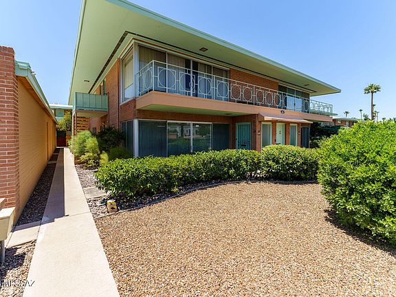 Ground unit. This 55+ iconic community in the Sam Hughes historic neighborhood is one of Tucson's most recognizable communities; officially listed on the National Register of Historic Places. With classic touches that elevate this Mid-Century Modern design, you will be impressed at every turn! These iconic Lionel Mayell designed condos do not last long! This ground unit has many upgrades that include: all new flooring, new paint, painted kitchen cabinet with turquoise hardware to match the turquoise refrigerator, tin backsplash, built in microwave, built in oven and a cooktop. Beautifully remodeled bathroom with new vanity, mirror, lighting, toilet, shower with tile surround and new plumbing fixtures; The family room is very large.