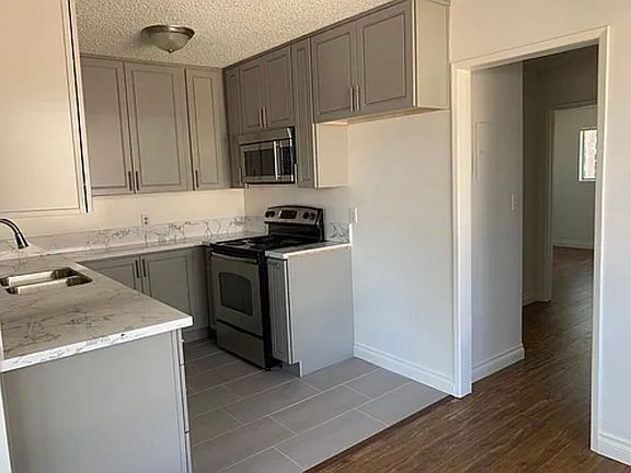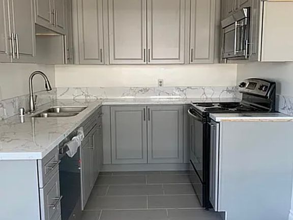 * Kitchen includes designer gray kitchen cabinets, quartz counters, porcelain tile, stainless steel appliances including dishwasher, range and built-in microwave oven (refrigerator is included)