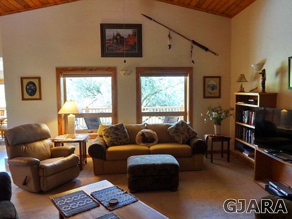 Very attractive, rancher with walk-out lower level right on Tiara Rado golf course. Spacious covered deck and lower level patio to enjoy Colorado National Monument and golf course beauty. This home has been meticulously maintained and shows a great deal of pride of ownership. Main floor is open concept with cathedral ceilings of beetle kill pine, large windows allowing an abundance of natural light, kitchen with granite countertops and custom cabinetry and a beautiful wet bar for easy entertaining. Master suite on main floor with sliding door to access the deck. Guest room with adjoining bathroom and office complete the main floor. Lower level is a large bonus/family room, laundry/utility room and bathroom. Beautifully landscaped and ready now. Buyer to verify information including measurements subject to error/change.
