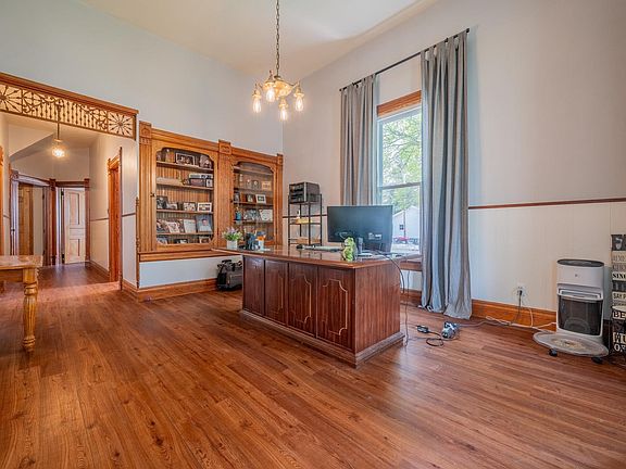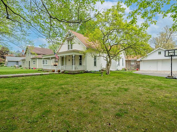 From the moment you arrive, you'll fall in love with the expansive wrap-around porch. Step inside to discover beautiful hardwood floors and woodwork, along with 10+ foot ceilings. The main floor layout offers an abundance of natural light along with a functional flow. Enjoy cooking in your spacious kitchen that features a built-in coffee bar, walk-in pantry, and a full appliance package. The primary bedroom is located on the main floor, with two additional bedrooms on the upper level. A finished loft space is located off the kitchen with a separate stairway, providing space for a home office, gaming, or other housing needs. Outside, the fenced-in backyard offers privacy and space for your outdoor hobbies. A detached heated garage provides convenient parking and loft storage - ideal for hobbyists or those cold winter days. In 2021 a new central air unit and furnace were installed, along with new duct work ran to the upstairs. Sump pump is 2 years old. Spray foam insulation added in 2022. Riding mower included!