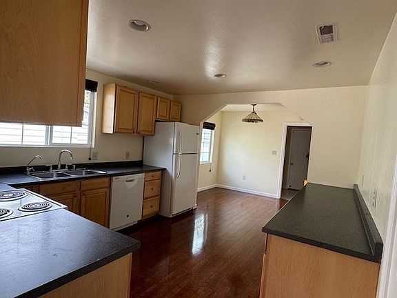 Featuring 3 spacious bedrooms and 2 full bathrooms, this home includes a detached two-car garage and a thoughtfully designed floor plan. The inviting living room boasts gleaming hardwood floors, while the adjacent dining area flows seamlessly into a generous kitchen equipped with an electric range, dishwasher, and refrigerator perfect for everyday living and entertaining.