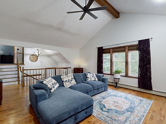 This spacious contemporary home offers over 3,100 sq. ft. of living space and is privately set on a .71-acre lot in a desirable location. The bright, open layout features cathedral ceilings, hardwood floors, and a welcoming living and formal dining area with built-ins. The home includes 4 bedrooms and 3 full baths, with a generous primary suite featuring a jetted tub. Updates include newly replaced kitchen appliances, several new windows in the dining room, living room, and three bedrooms, new basement flooring, and an epoxied garage floor. No worries with the roof & heating system being less than 10 years old. The finished basement provides an impressive entertainment space complete with a pellet stove, slider to the patio, and the included pool table, TV, and sofa. Outside, enjoy the beautifully landscaped yard, a relaxing deck, and a concrete patio already wired and ready for your hot tub! This home combines privacy, space, and modern updates, making it a wonderful place to call home.