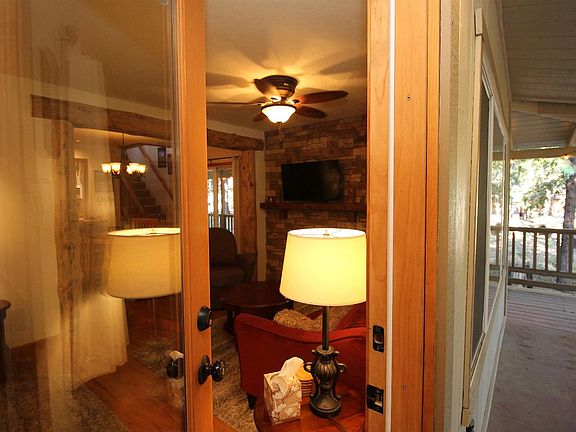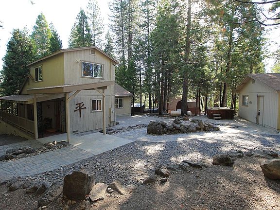 Located at the summit of Lilac Park lies this serene mountain getaway nestled in a grand bouquet of trees. Log accents throughout coupled with the grand stone hearth complement the rustic, cozy theme of this unique find. The home features 2 bedrooms on the main floor with a private master suite upstairs in addition to 2 baths and an oversized 2-car garage. Boasting nearly half an acre, the oversized street to street lot lends a feeling of quiet seclusion to the property. The professionally landscaped courtyard sets the stage for morning coffee in the sun and evening huddles around the fire pit. Ample windows throughout provide a plethora of natural light and create a seamless transition between the indoors and outdoors for full enjoyment of all the Sierra landscape has to offer. The open kitchen is perfect for entertaining friends and family. Conveniently located between Murphys and Bear valley for skiers and wine enthusiasts alike. Fully furnished and ready to enjoy, just bring your toothbrush!
