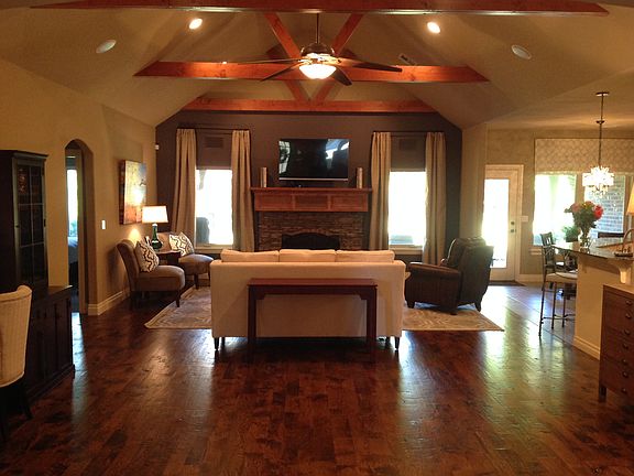 4 bed down, game room/theater up, new lighting throughout, granite and quartz countertops, new hand scraped oak floors, vaulted/tray ceilings, oversized living with surround sound, large kitchen with island, lots of storage and countertops. Master bed has high ceilings, crown moldings and fireplace. Master bath has whirlpool tub and shower has dual shower heads. Huge walk-in closet with built in dressers. Safe room in garage. Oversized backyard with large covered patio. Neighborhood pool, park, trails, basketball court.