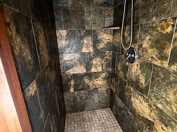 Generously-sized tiled showerCharming bathroomLarge backyardVintage vanity