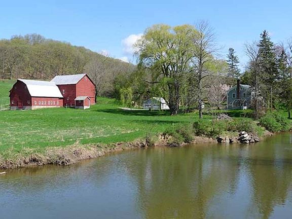 Historic Cauterskill Creek Farm - a 19th century dairy farm on 145 acres of open rolling fields, farmland & creek with acreage on both sides of the NYS Thruway. The half mile long driveway is bordered by the meandering Kaaterskill Creek (the land consists of three quarter mile of creek frontage) The 1840s barns & farmhouse complex is scenically sited with creek views from every window. The vintage 3 BR house offers a large country kitchen, living room, family room, two small studies and a greenhouse accessed from the living room. The garage, three barn complex and milk house total over 6000 sf. This massive post and beam structure houses the front-end tractor, hogger, hay wagons, mowers and more. All equipment is included. Your own country estate to enjoy farming, hiking, fishing, kayaking and cave exploration through 1100 ft of Jack Packer's Cave and just minutes to the Village of Catskill.
