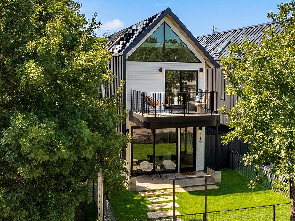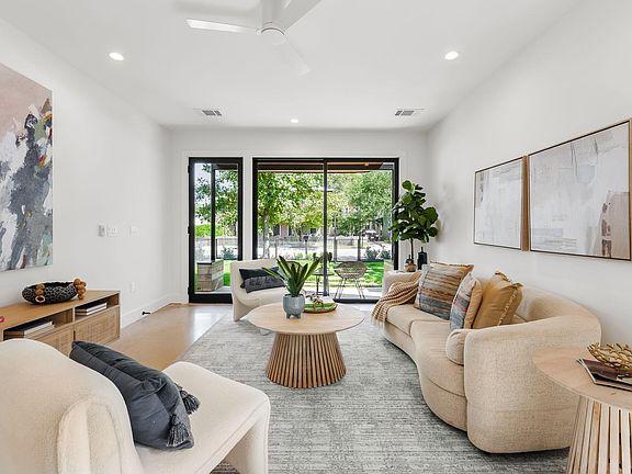 Completed in 2025, this striking home, designed by Ravel Architecture, merges sculptural form with natural warmth, embodying the best of modern Austin living. Clean vertical lines, soaring rooflines, expansive Marvin windows, skylights, and a standing seam metal roof fill the home with light, creating spaces that feel both refined and welcoming. Every detail inside is designed for both visual harmony and everyday livability. The chef’s kitchen commands attention with custom riff-sawn white oak cabinetry, a quartz waterfall island, artisan tile backsplash, and professional-grade appliances. Upstairs, the primary suite is a private retreat beneath vaulted wood-beamed ceilings, with a spa-inspired bath, a large walk-in closet, and a balcony perched among the treetops. Each additional bedroom includes a private ensuite with designer tile and loads of natural light, maintaining the home’s cohesive design throughout. Outdoors, a fenced front yard, covered porch, and a distinctive upper-level terrace with a curved steel railing invite morning coffee or sunset gatherings. Energy-efficient features, such as foam insulation and standing seam metal rooof, along with a finished garage with storage, underscore lasting quality and comfort. Situated in Austin’s vibrant North Loop, you’re steps from local favorites like Home Slice, Epoch Coffee, and Foreign & Domestic. This home strikes the perfect balance: architectural precision, urban convenience, and an authentic connection to Austin’s creative spirit.