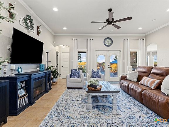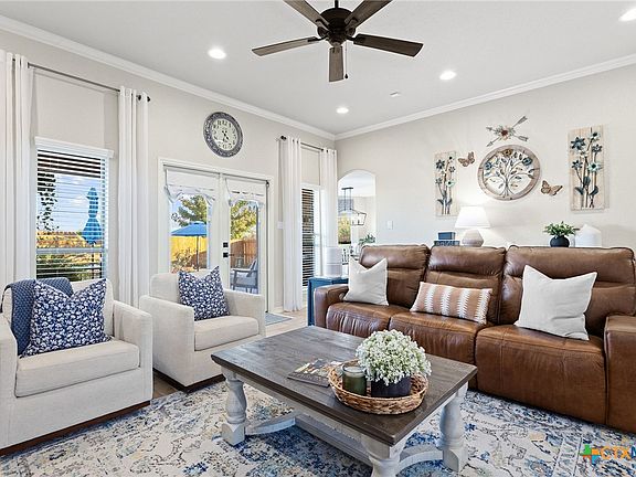 Inside, the home feels peaceful, inviting, and truly move-in ready thanks to a long list of thoughtful upgrades all completed within the last 4 years. The open layout offers an oversized living room with high ceilings and French doors that lead to the covered patio. The kitchen showcases granite countertops, new faucet, stylish tile backsplash, GE stainless appliances, low-profile GE double oven with air fryer, plus dishwasher and microwave—all perfectly matched.