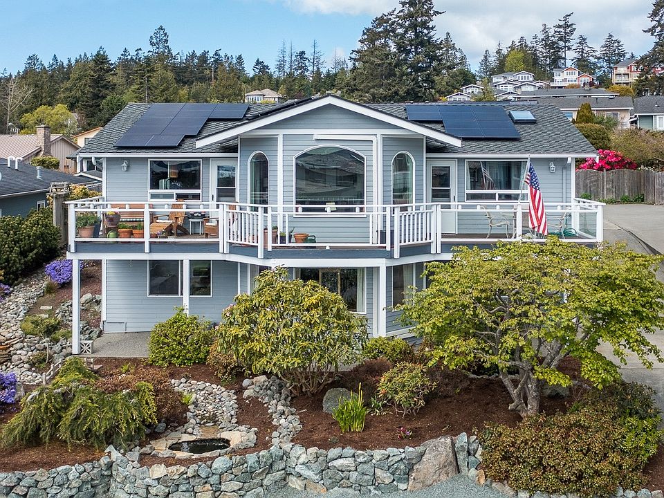 Such a warm & beautifully remodeled Skyline home boasting views of Burrows Bay, surrounding islands, Olympics & marina. Embrace eco-conscious living with energy-efficient solar panels. Main level offers serene primary suite featuring direct access to deck & sumptuous full bath. Entertain in the well-appointed kitchen & dining areas, complemented by distinctive architectural elements such as arch windows in the living rm. Lower level offers versatile living options including two bedrms, full bth, office & flex room with kitchenette & family rm. Flooded with natural light & open spaces, this home is a haven for relaxation & rejuvenation. Enjoy outdoor living with lush raised gardens, charming pergola, tranquil water feature & RV/boat parking.
