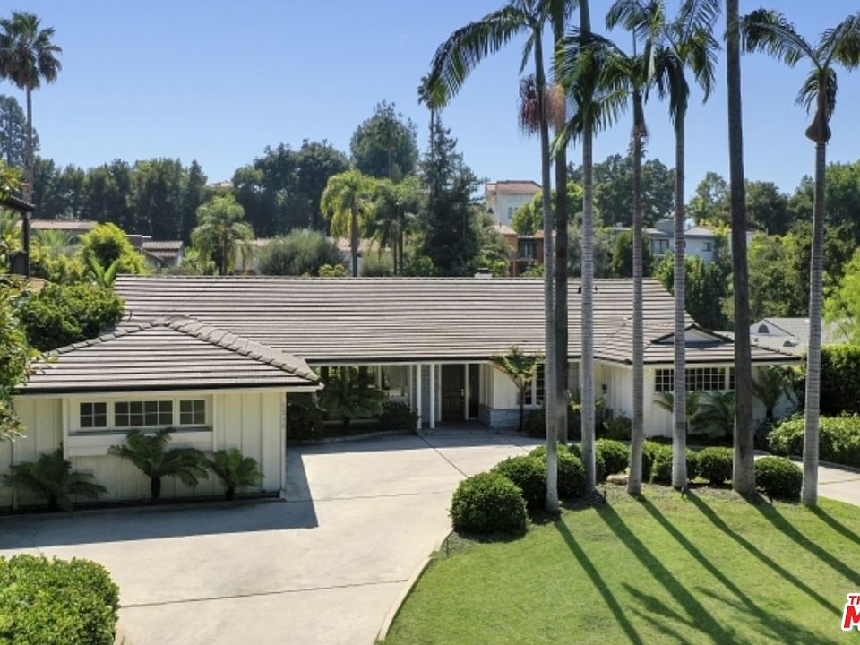 A Montecito-Style Garden Home in Laughlin Park: The Bachman-Newman House, 1953, by Leo F. Bachman, architect. An "H" inspires the floor plan of this classic, one-story Mid-Century Modern Laughlin Park home. A central, front-to-back great room combines a dining area and spacious living room with open rafters, soffit and stone fireplace that opens to a covered patio with fireplace overlooking a lush private rose garden with lawn and pond. Adjacent is a long family room with 3rd stone fireplace, wet bar and garden aspect. The service wing contains the double garage with direct entry to the laundry room, maid's room and bath, large, skylit kitchen/breakfast area with garden view. The other wing contains two family/guest bedrooms, one bath plus a large master suite with built-ins, ample closet space, bath and garden view. The house lies well back of the boulevard on its own semi-circular drive with extra parking. Rear entrance via the Laughlin Park Mews. Impeccably maintained.