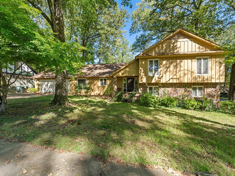 Large wooded lot with 4 bedrooms, 3 baths; tri-level home with wood and stone exterior. Features two primary suites—one up, one down—perfect for guests or multigenerational living. Hardwood floors throughout with carpeted bedrooms. Upstairs living room plus a den with built-in shelving. Kitchen offers double ovens, two pantries, and includes refrigerator, washer, and dryer. HVAC replaced in 2019, water heater 2021, and new roof in 2011. Pool with vinyl liner (not currently in service). One-car garage with remote and laundry closet downstairs. Spacious and full of potential!