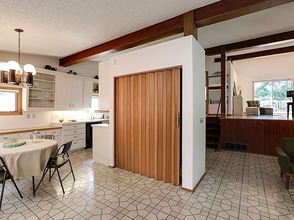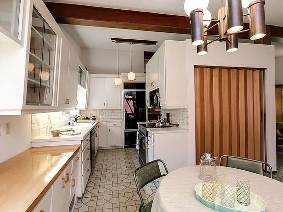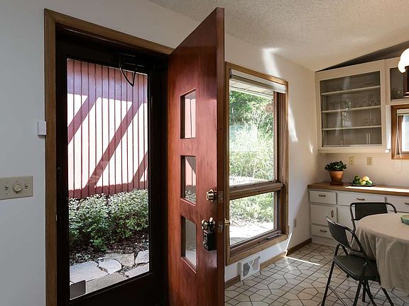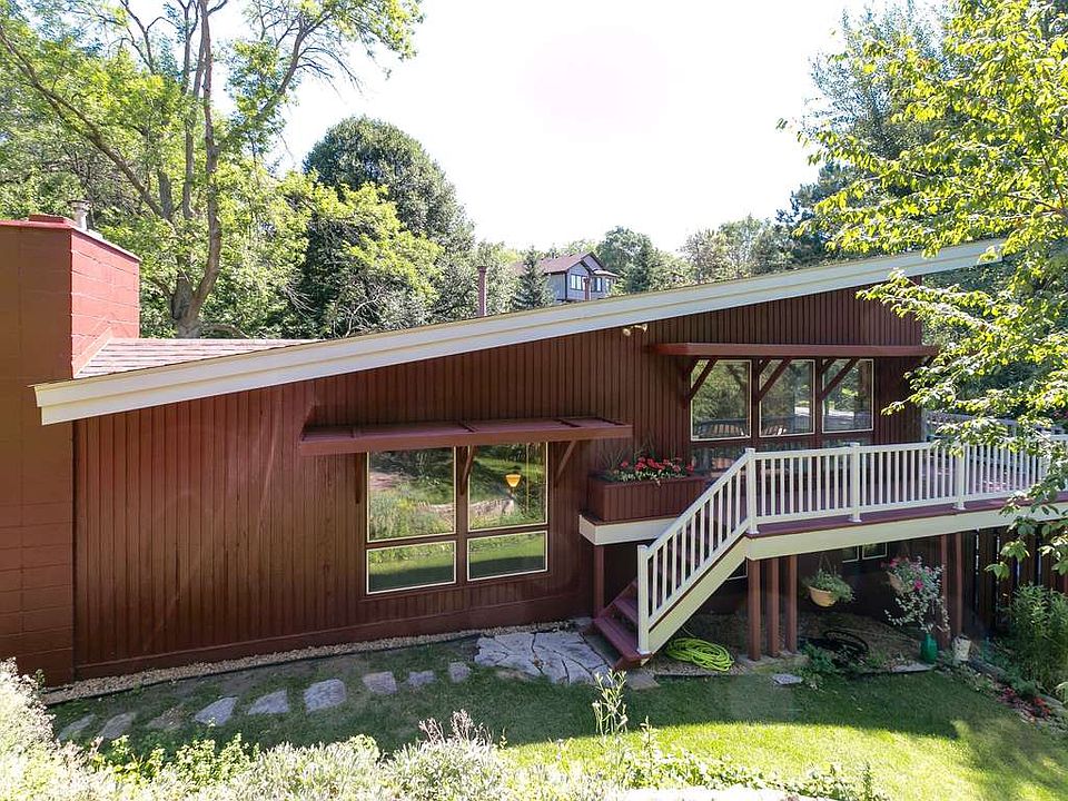 Exquisite andarchitect-designed, this 1957Minnesota Mid-Century Modern home offers youthe peaceful seclusion of a lake home combined with the easy convenience of a city. Nestled among twenty-one different kinds of gardensthat span overa third of an acre upon a wooded hillside--near thehighest elevation in the Twin Cities--this triple-split-level features thelong, sloping planes of a'butterfly-wing' roofline, according to architectural historian and author,Jane King Hession. Vertical lines of the cedar siding, horizontal lines of the wraparound deck, and stacked blocksof thetwo fireplace chimneyscombine withoriginality and timeless designto create a one-of-a-kind property. Stroll down the broad Chilton limestone steps and along stone paths meanderingthrough lushgardens. Step inside to the warmth of the welcoming-level family room andflick a switch to enjoydancing flames in afireplace crafted of honest concrete block.Savor the simple yet elegant lines of uniqueperiod cabinetrywhichlink the dining room, with its built-in buffet and glassdisplay shelving, to thewell-designed kitchen. Beneath your feet, professionally-restored vintage vinyl floors gleam. The vaulted ceilings and open floor design invite you to the upper level, with its own living area surrounded by walls of windows that face south and west; sliding glass doors allow you to walk out to the wraparound deck. Plenty of foliage keeps it private in summer; in winter, bare branchesreveal stunning sunset vistas of Minneapolis. Natural, oaken hardwood floors--freshly refinished--extend into the master bedroom, which includes the original, architect-designed queen-size pedestal bed and built-in furniture of Philippine Mahogany, complemented by two large closets. On the garden level you will find a double bedroom separated by a 50's-eraPella accordion wall, a second bathroom, and two more expansion rooms--both added with continuity of design by the same architect in 1964. As upstairs, each has beamed andvaulted ceilings. Outside, through two sets ofsliding glass doors, charming stone patiosbeckon fromthe east and westsides of the entertainment room. The butternut-paneled library surprises visitors with a mini-kitchen/wet bar on one side and on the other,a second, handsomeconcrete blockfireplace--easily lit by aswitch. Counterbalanced by the north wall's transom windows, thesouth wall--of glass--holds the home's fourth sliding glass door, which opens onto yet another patio; here, on a hillock, ababbling brookletcurves and flows into asoothing water garden. High above the Mississippi Valley,thegentle downside of this wooded hill displays a mini-arboretum of sloping lawns, luxuriant gardens, and an unusualarray of trees: Russian river birch, linden, crab apple, green ash, Japanese lilac, elm,pine,spruce. Beneaththeglorious malegingko tree a wild woodland garden flourishes,home to the endangered False Solomon Seal plant. Please take a few moments to walk the property, enjoy the raised stoneoutdoor 'tree room', note the children's amenities,and explore the various gardens: cottage, hosta, prairie, shade, Zen, and more. Geneva S. Eschweiler, the current owner--and the second ever--is a nationally-known voice instructor, whose students have been courted by such schools as theJuilliard School of Music, Peabody Conservatory, and St. Olaf College. Operas by Mozart, Barab,and Purcell were performed here;this home and these gardens are filled withjoyous echoes of decades of music. One of Geneva's grandchildren said, "Grandma, when we come to your house--it's magic!" Genevadearly desires to findthe future homeowner who will continue to love and cherish this enchanting andsacred space. Could it be you? Highlights & Features: Classic Mid-Century Modern design: strong influence byrenowned architect Elizabeth Close (and, some say, Frank Lloyd Wright) Sensitive placement ofthe dwellingwithin nature;lovely views Vaulted ceilings and wood beam design on three lev