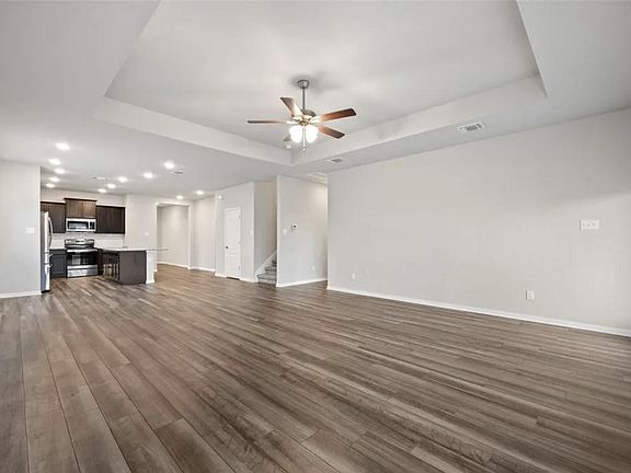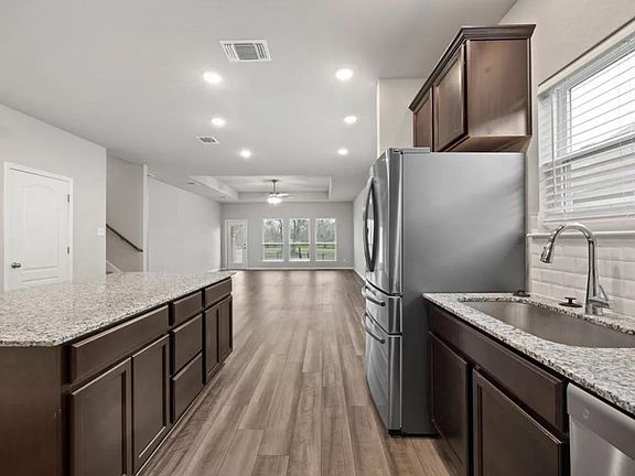 Stone-adorned two-story homeStainless steel appliancesAbundance of natural lightThoughtful floor planSerene greeneryVinyl flooringCovered patio