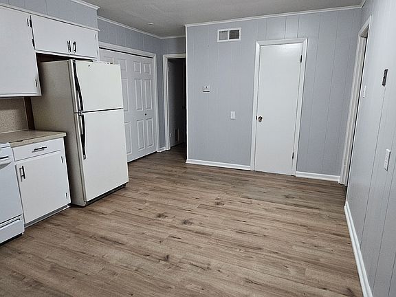 This is a ground-floor unit with two bedrooms and one bathroom. New vinyl flooring and a fresh coat of paint have been applied throughout the apartment.