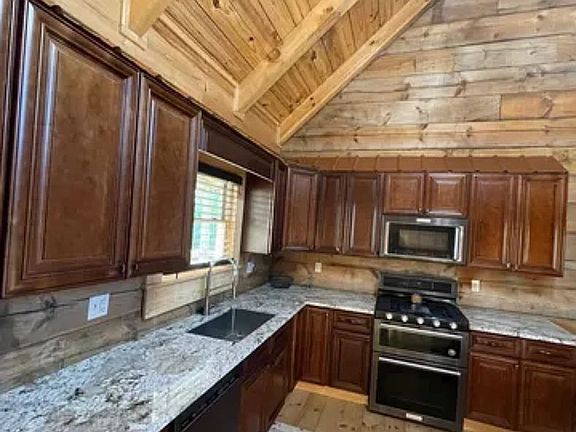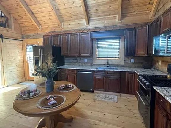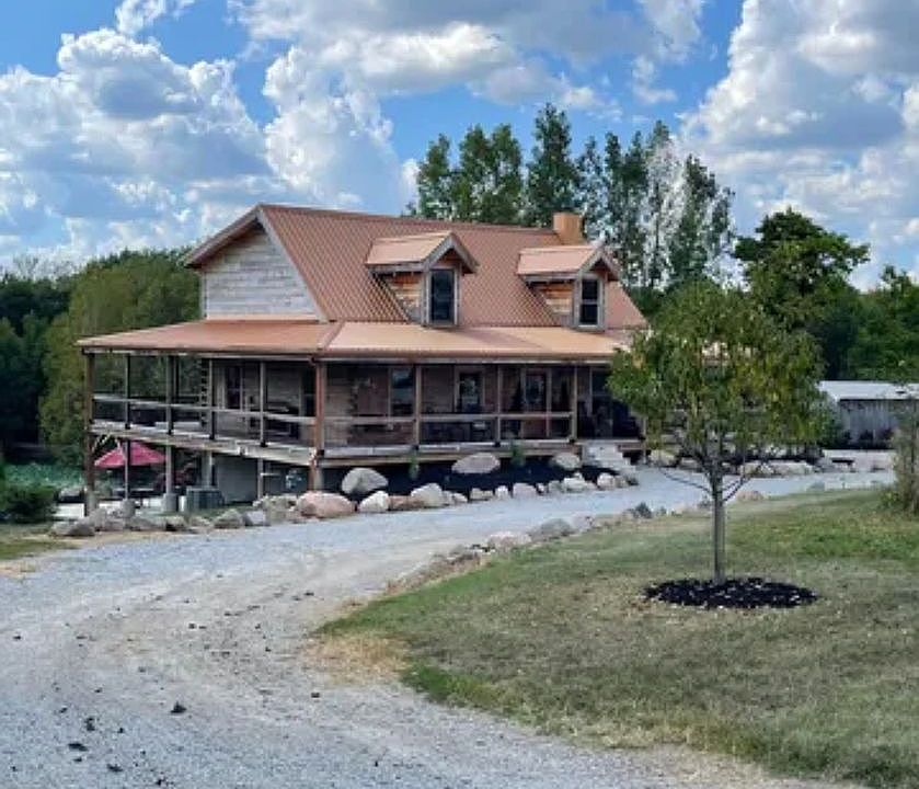 Log cabin homeOverlooks the pondLoft areaWrap around porchAmazing viewsWalk out basement