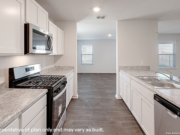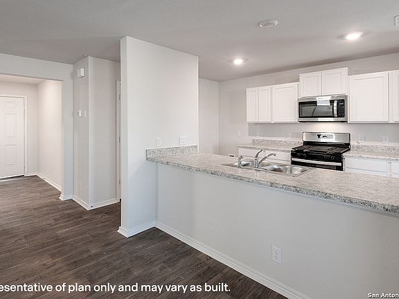 Welcome to The Wolters, a stunning two-story home featured in our Riverstone at Westpointe community in San Antonio, TX. This floor plan offers 3 classic front exteriors, a 1-car garage, and a full yard landscaping and irrigation package, ensuring your home looks its best every single day. Inside this 4 bedroom, 3 bathroom home, you'll find 2530 square feet of open-concept living. A inviting from porch and foyer leads to a blended living room, kitchen and dining area, perfect for entertaining and every day living. Your kitchen includes quartz counter tops, stainless steel appliances and shaker style cabinetry. The corner pantry is spacious and includes plenty of built-in shelving. A laundry room is also conveniently located off the kitchen and connect to the garage. With a secondary bedroom and full bath located off the front foyer, this home offers private space for out-of-town guests. Head up the wide staircase to find a versatile loft with storage space, the private main bedroom suite, two secluded secondary bedrooms with carpet flooring and walk-in closets and a third full bath. The private main bedroom is an oasis, featuring an attractive ensuite bathroom and oversized walk-in closet. Enjoy quality quartz vanity tops, a combined bath tub and shower and plenty of counter space. Additional features include sheet vinyl flooring in entry, living room, and all wet areas, quartz bathroom counter tops, and our HOME IS CONNECTED base package. Using one central hub that talks to all the devices in your home, you can control the lights, thermostat and locks, all from your cellular device.