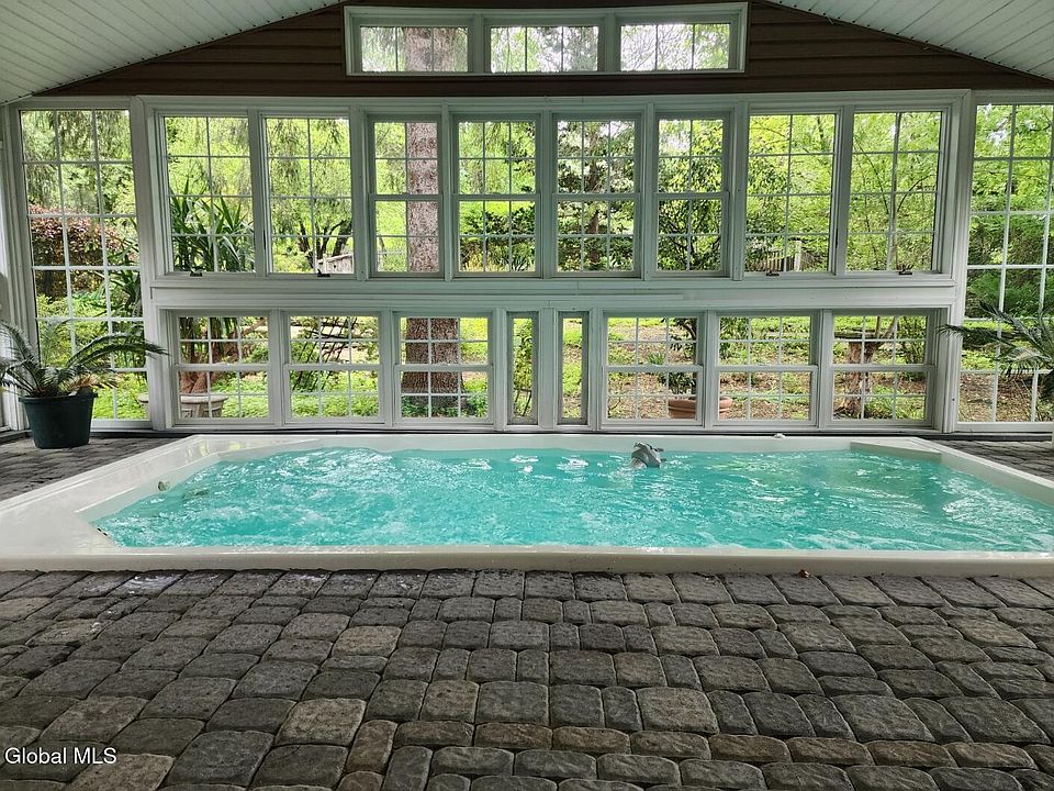 Discover a one-of-a-kind residence where sophistication meets relaxation. The extraordinary home features an indoor infinity pool and hot tub set within a four-season heated sunroom-your own private spa retreat, let the stresses of the day melt away no matter the weather. It overlooks the garden, stone Patio, wonderful to dine alfresco and so much more. Private landscaped grounds. Outdoor fireplace, if you love stone walls, cascading pools, waterfalls and private gardens you will be enchanted by the charm of this unique property. This Contemporary 4-bedroom 2 bath home, 2 car attached garage features a Great room with Stone Fireplace and slate floors. Gourmet kitchen, lots of cabinet and countertop space, excellent for entertaining. Formal Dining room, an open floor plan creates inviting space throughout. 1st floor bedroom and full bath. Large master bedroom, private balcony, full master bath, shower and spa inspired garden tub. The addition could easily be converted to in law space with private spiral staircase from the garage. Zoned radiant heating. 2 story Gazebo with stone pavers on the ground level, 2 ponds. Babbling brook, Observation deck. Covered grape vine canopy. Outstanding BNB potential or just keep it all for yourself. This is more than a home it's a healthy lifestyle.