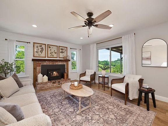 Among rolling hills, this property is like a dream and is unlike anything else on the market. Charming and classic, this modern farmhouse features a view that simply cannot be missed. You will want to sit out on the back patio or in the pasture for hours listening to the wind in the trees, gazing at the rolling hills, local ponds, and grapevines. Step inside and you will find rustic elegance throughout. The wood ceramic plank flooring throughout and the hexagon tiles in the bathrooms are a real highlight. Fresh interior and exterior paint, a brand new 30 yr roof, new Anderson lifetime windows, and other updates make this home not only turnkey, but a retreat. This home is ready for animals and the homestead you have been longing for. There are 2 large fenced and cross fenced pastures, 1 smaller fenced area that makes for large chicken area with a coop, several areas of shade and a single stall structure with a lean to for goats or horses, an additional fenced area with raised garden beds, 1/2 of irrigation water in the summer that feeds the year round pond, and an amazing well producing 15 gal / min. With four bedrooms, two and a half baths, multiple living areas, and a large kitchen this home is not lacking areas to entertain.