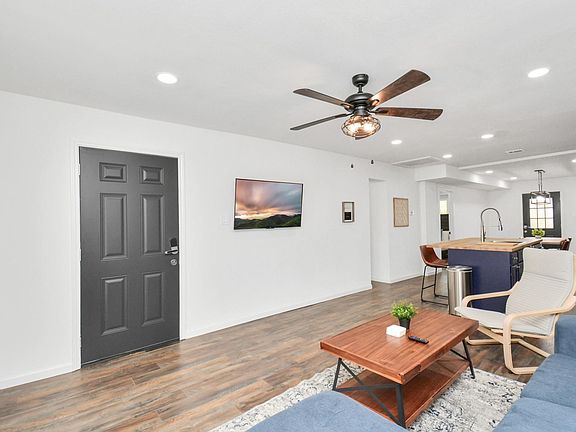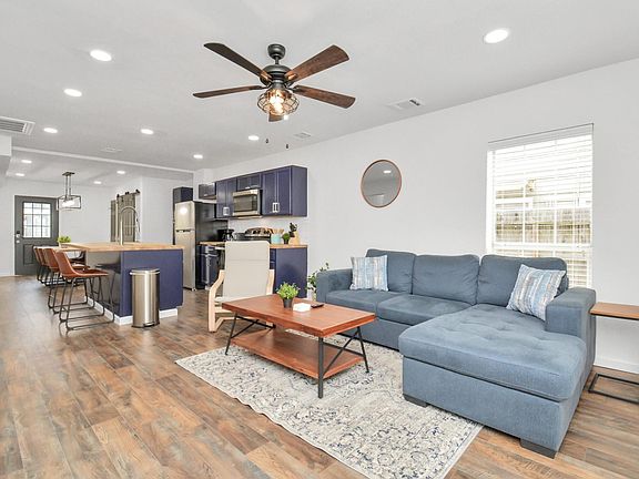 A beautifully renovated and fully furnished multi-family property offering style, comfort, and versatility. This two-story home features a modern white brick exterior with a charming covered entry. Inside, enjoy an open-concept layout with warm wood-style floors, recessed lighting, and a spacious living area that flows seamlessly into the dining and kitchen spaces. The chef-inspired kitchen boasts bold navy cabinetry, butcher block counters, stainless steel appliances, and an oversized island with seating. Bedrooms are generously sized, including a serene primary suite with a walk-in closet and spa-like bath featuring dual sinks, chic patterned tile floors, and a frameless glass shower. Each unit comes tastefully furnished with quality pieces, from comfortable sofas to stylish dining sets and beds, making it truly move-in ready. Additional highlights include in-unit laundry, updated fixtures, and a private fenced yard. Perfectly located near universities, dining, and downtown.