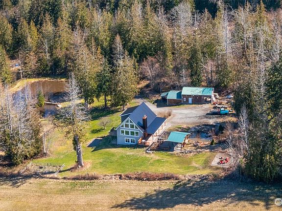 Enjoy private, tranquil 5 acres, a pond, sunset views, & majestic mountains views. Surrounded by trees on 3 sides, you will love this location! Top floor is Primary Suite loft, bath w tub & shower, walk-in closet. Main floor great room w cathedral ceiling & a wall of view windows, bdrm, bath, & laundry. Down is daylight bsmnt family room, woodstove, kitchenette, 3rd bdrm, bath, + 2 more rooms, & 2nd laundry. M-I-L, poss ADU. New metal roof, siding, paint in 2022. New Heat Pump & Furnace, newer water heater & fridge. Shop -could use some love, w 220 pwr, covered parking, & apt w frozen pipe damage. Fire pit patio to enjoy a quiet evening, BBQ area for outdoor dining. Chicken coup/goat pen, Fort/shed in the woods. Great place to call home!