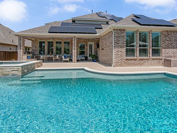 Welcome to quiet luxury living at its finest in Flower Mound with this stunning 5-bedroom, 4-bath estate, meticulously designed for comfort and entertainment. Expansive upgrades throughout! Nestled on a peaceful cul-de-sac and backing to a scenic greenbelt, this home offers the perfect blend of privacy, space, and sophistication. Step outside to your resort-style saltwater pool and spa, with tranquil greenbelt views. Motorized screens on patio for privacy, sun and wind protection. The spacious bedrooms provide an inviting retreat while the Chef’s kitchen, equipped with high-end appliances and ample storage, is a dream for culinary enthusiasts and perfect for hosting gatherings. 33 solar panels PAID OFF! Low energy bills and Smart Home technology.