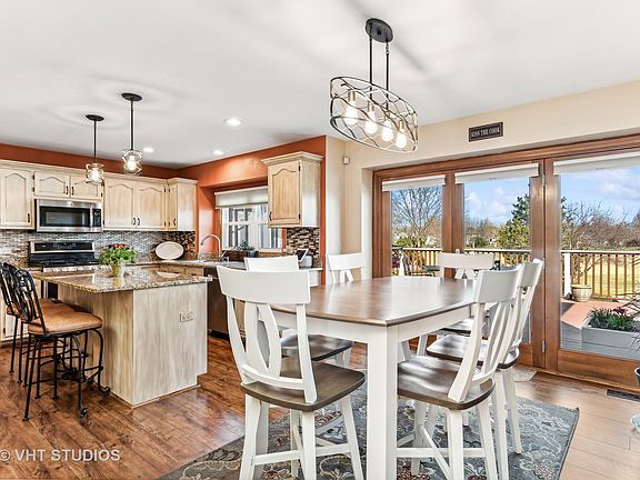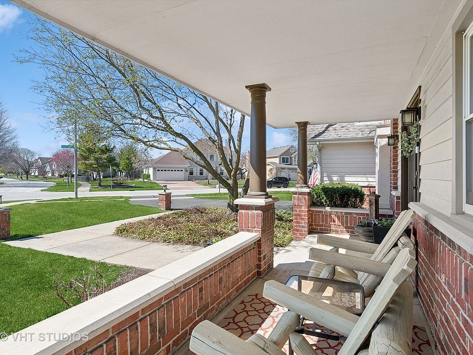 Situated in the highly desirable High Meadow neighborhood, this home boasts stunning curb appeal, set on a professionally landscaped corner lot with a covered porch that provides the perfect spot for enjoying breathtaking sunsets. As you step inside, you'll be greeted by the spacious 2-story foyer, flooded with natural light, offering a seamless flow to the expansive deck and adjacent open space, ensuring privacy and tranquility with no neighbors directly behind. Architectural sophistication abounds throughout the home, from the family room's ceiling beams to the corner floor-to-ceiling fireplace, to the angled windows that add character and charm to every corner. The formal living room, with built-in shelves and pocket doors leading to the family room and French doors to the foyer, offers versatility as it can be used as a home office or cozy reading room. The heart of the home lies in the beautifully appointed kitchen, featuring an eat-in dining area, island with seating, and adjacent formal dining room. Boasting gorgeous lighting, a closet pantry, stainless steel appliances, and granite counters, this kitchen is a chef's delight. Upstairs, you'll find the primary bedroom retreat, complete with a walk-in closet and an en-suite bathroom that exudes spa-like tranquility. The fully renovated bathroom features a freestanding deep water tub, heated floors, a stunning shower for two with rainhead showers, body sprayers and a swirling stone shower floor that is an artistic feature of the room. Three additional generously sized bedrooms, two with walk-in closets, provide ample space for family and guests, with one featuring a balcony with room for a seating area. The fully finished basement is an entertainer's dream, featuring a kitchenette, 5th bedroom, recreation area, and a full bathroom, along with plenty of storage space to meet all your organizational needs. Outside, the backyard oasis awaits, with an expansive 20x40 foot deck perfect for hosting family gatherings, a screened porch perfect for enjoying those summer nights with a favorite beverage and a paver patio with a tranquil waterfall, firepit and wall seating, providing the perfect retreat for relaxation and enjoyment. Located in the acclaimed Indian Prairie School District, students walk to Graham Elementary School just a block away, and are bused to Crone Middle School, and Neuqua Valley High School. Owners can purchase a membership in the nearby South Pointe Swim Club or River Run Club as available. Don't miss out on the opportunity to make 5216 Thatcher Drive your forever home!