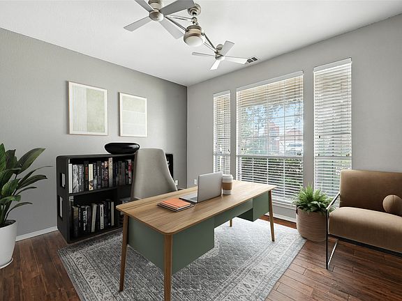 Inviting fireplaceWood flooringOpen-concept floor planLarge covered patioOutdoor livingStainless steel appliancesPrivate home office