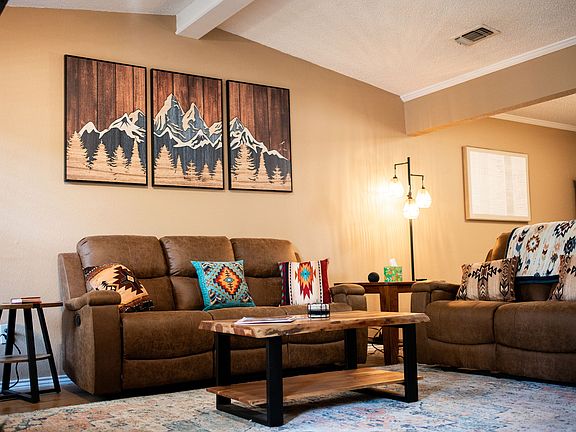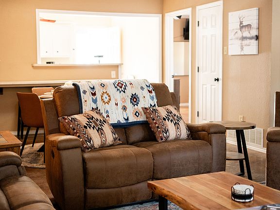 Welcome to your home-away-from-home in Lubbock! This spacious 3-bedroom, 2-bathroom home (1,600 sq ft) comfortably accommodates up to 6 guests, featuring two king bedrooms and one queen bedroom. Enjoy a warm and inviting living room with reclining sofas and a fireplace, a formal dining room for family meals, and a breakfast nook perfect for coffee or casual dining. The fully equipped kitchen, in-unit washer/dryer, and fast Wi-Fi make long stays effortless. Relax outdoors in the private backyard with patio seating and a grill, or take advantage of the two-car garage for secure parking. Conveniently located near shopping, dining, and major employers, this home is ideal for traveling professionals, medical staff, or families looking for comfort and convenience.