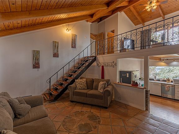 SO MUCH VALUE for a mountain retreat on large fenced lot.  Great space for all the family, pets & toys!  Check out the virtual walk-thru to get a real feel for this winner!  Enter to soaring ceilings with wood beams and plenty of glass!  Extra bonus room plus loft for relaxation.   A single garage has an attached carport in front, heated workshop behind it and RV parking beside.  Huge dual-pane windows offer tons of natural light, plus phenomenal views of snow-capped mountains from kitchen picture window and upstairs rooms and deck!  NEW roof installed last year. Iimpressive tile in living and dining rooms plus new carpet in downstairs bedrooms installed this year.  A wood-burning fireplace insert offers cozy efficiency for chilly evenings.  Enjoy expansive rear yard with gate leading to the wash.  A number of convenient storage spaces inside and out.  Seller finishing a couple of cleanup tasks.   Don't miss this chance to add your personal touch to this special cabin in the woods with easy commute. NOT in flood zone & clear pest control inspection already in.  Hwy.  Spring is blooming!  Must wee NOW!