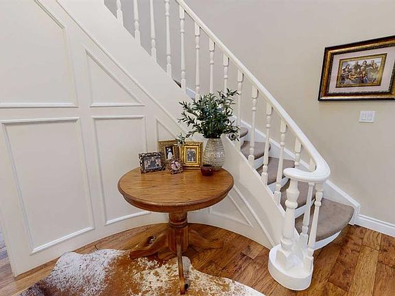 Central spiral staircaseEngineered hardwoodFormal dining roomCorian countertopsStainless steel appliancesCoffee barBuilt-in desk