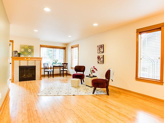 Escape the hustle & bustle of Seattle in this spacious & bright, end unit res. condo! In quiet neighborhood, 3 bed & 2.25 bath w/ fabulous bamboo hardwoods, tastefully tiled bathrooms, gas fireplace, & vaulted ceilings. Downstairs bed has 3/4 bath to itself! Open floor plan throughout. Granite counters, stainless steel appliances, & bar seating in modern kitchen. Eat out on the deck when the sun is out! Fenced yard, full garage, no H/O dues! Close to downtown, freeway, buses, parks & gardens.