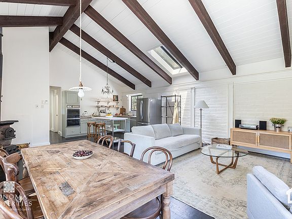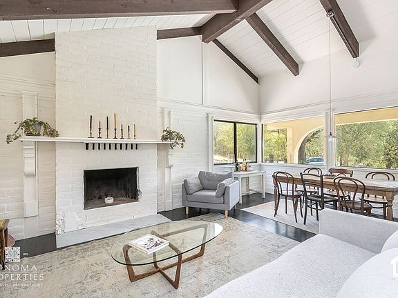 Set amidst rolling meadows framed by majestic oaks, this beautifully spacious 3-bedroom, 2-bathroom country home offers idyllic living in Glen Ellen. The kitchen opens to a warm and inviting living room featuring a wood-burning fireplace and open-beam vaulted ceilings, perfect for cozy evenings at home.