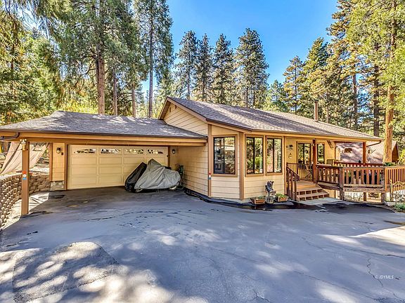 Quaint Single-Level Mountain Home w/ 2-Car Garage & Solar: This lovely corner lot mountain home is conveniently located ~4 miles from the center of town; Escaping the noise that a tourist town brings to a place where you can enjoy the peace and tranquility of the forest. Built in 2004, lots of thought and care was taken when choosing materials; from the fiber cement board siding, composite front and back porch, and don't forget about the paid-off solar (10 years left on lease). Step into an inviting open-concept living space w/ vaulted ceilings, knotty pine walls, and a free-standing wood burning stove to huddle around during those brisk fall evenings, making this the epitome of cozy mountain home. The kitchen w/ ample cabinetry and counter space is nicely positioned to overlook the living space. The nicely-sized primary bedroom features an en-suite full bathroom and walk-in closet. The guest bedroom also doubles as an office w/ a lovely built-in live edge custom desk and a large closet. In the hallway you will find a 3/4 guest bathroom and utility/linen closet. The laundry room is located off of the kitchen. 2-car garage, workshop, RV parking, and this home is generator ready (generator not included). This home is a must see.