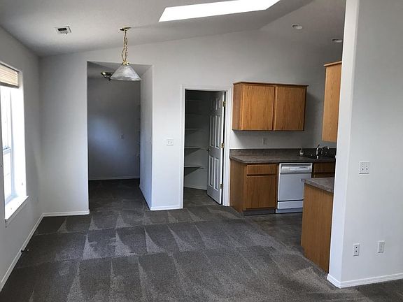 Large 2 bedroom with fenced back yard. Single garage with storage shelves. Office, pantry, forced air electric heat. Washer/Dryer, range, microwave, refrigerator, dishwasher. Skylights, vaulted ceiling in living and kitchen areas. Coat closet and storage closet. Owner pays water, sewer & garbage.
