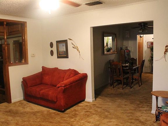 Large window in living room- open into dining area and den could be used as office or made into 3rd bedroom - updated bathroom large closets in the two bedrooms large kitchen with a lot of cabinet space and eating space unattached garage with electric and storage building, also has storm cellar on property, large back yard